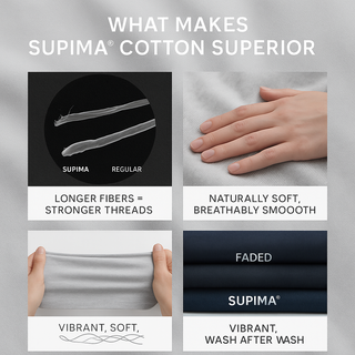 Experience the unmatched luxury of Supima® cotton, prized for its superior softness, strength, and lasting color. Grown exclusively in the USA, Supima® cotton fibers are longer, finer, and stronger than regular cotton, giving you an incredibly smooth feel with every wear. Breathable, durable, and naturally comfortable, it’s a fabric your skin will thank you for day after day.