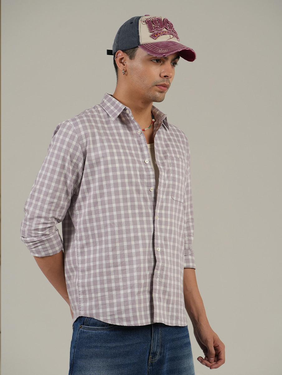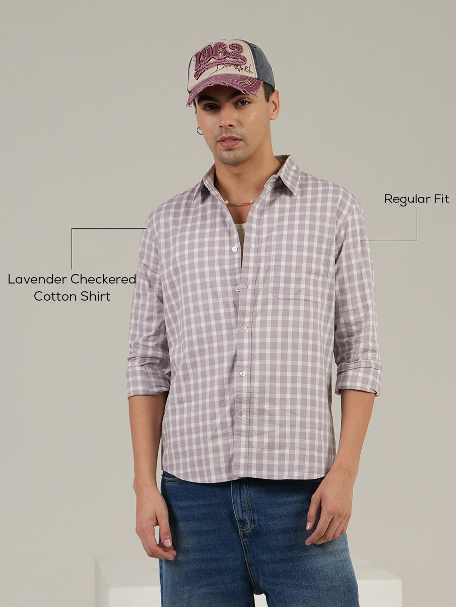 Refresh your everyday wardrobe with this stylish Lavender Checkered Full Sleeve Shirt. Designed with a classic normal collar and timeless grey check pattern, this shirt is made from 100% breathable cotton to ensure all-day comfort. The regular fit provides a relaxed yet flattering silhouette, while the rolled-up sleeves add a casual touch. Whether you’re heading out for brunch or a casual meeting, this versatile piece is your perfect go-to.