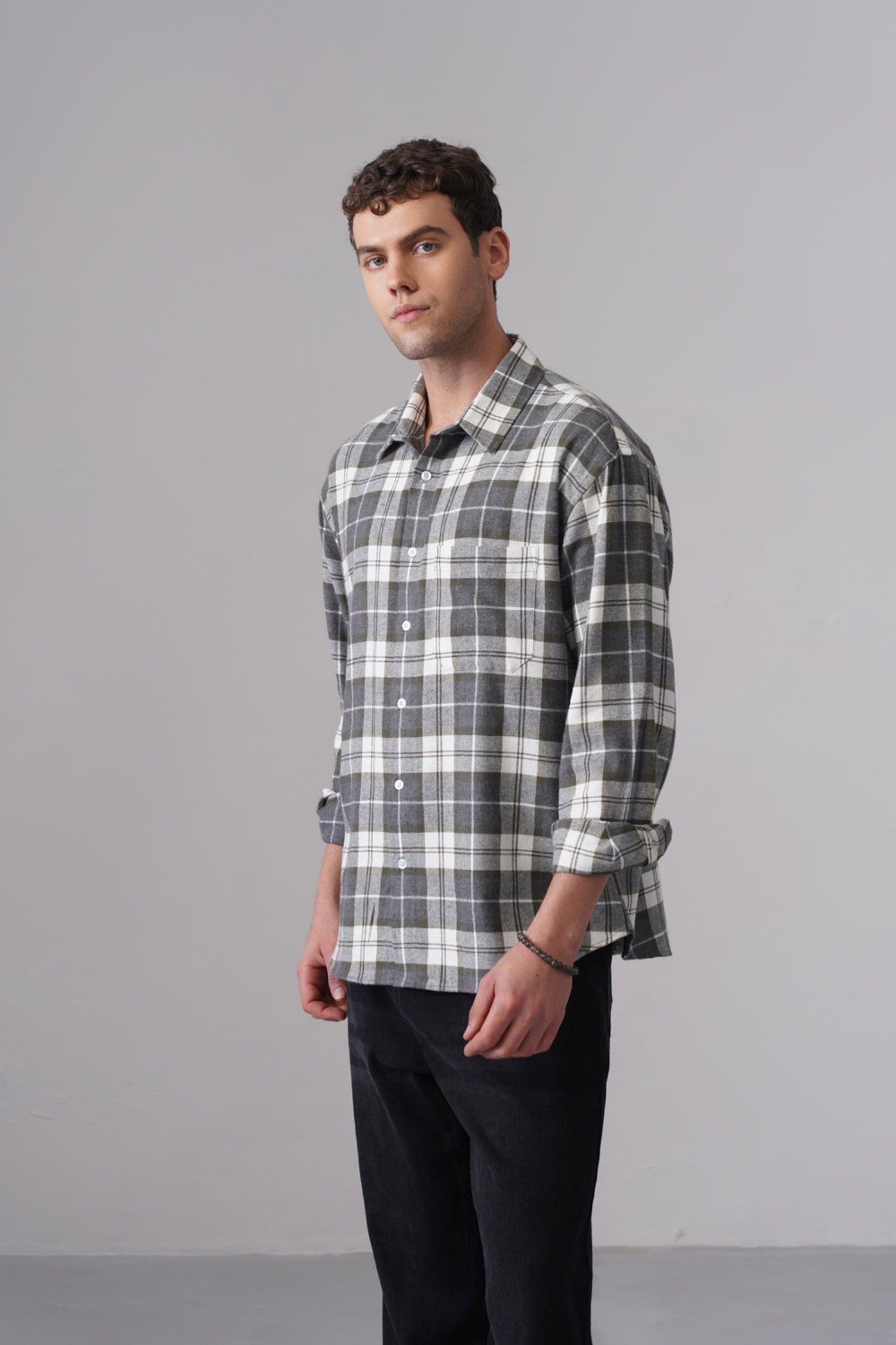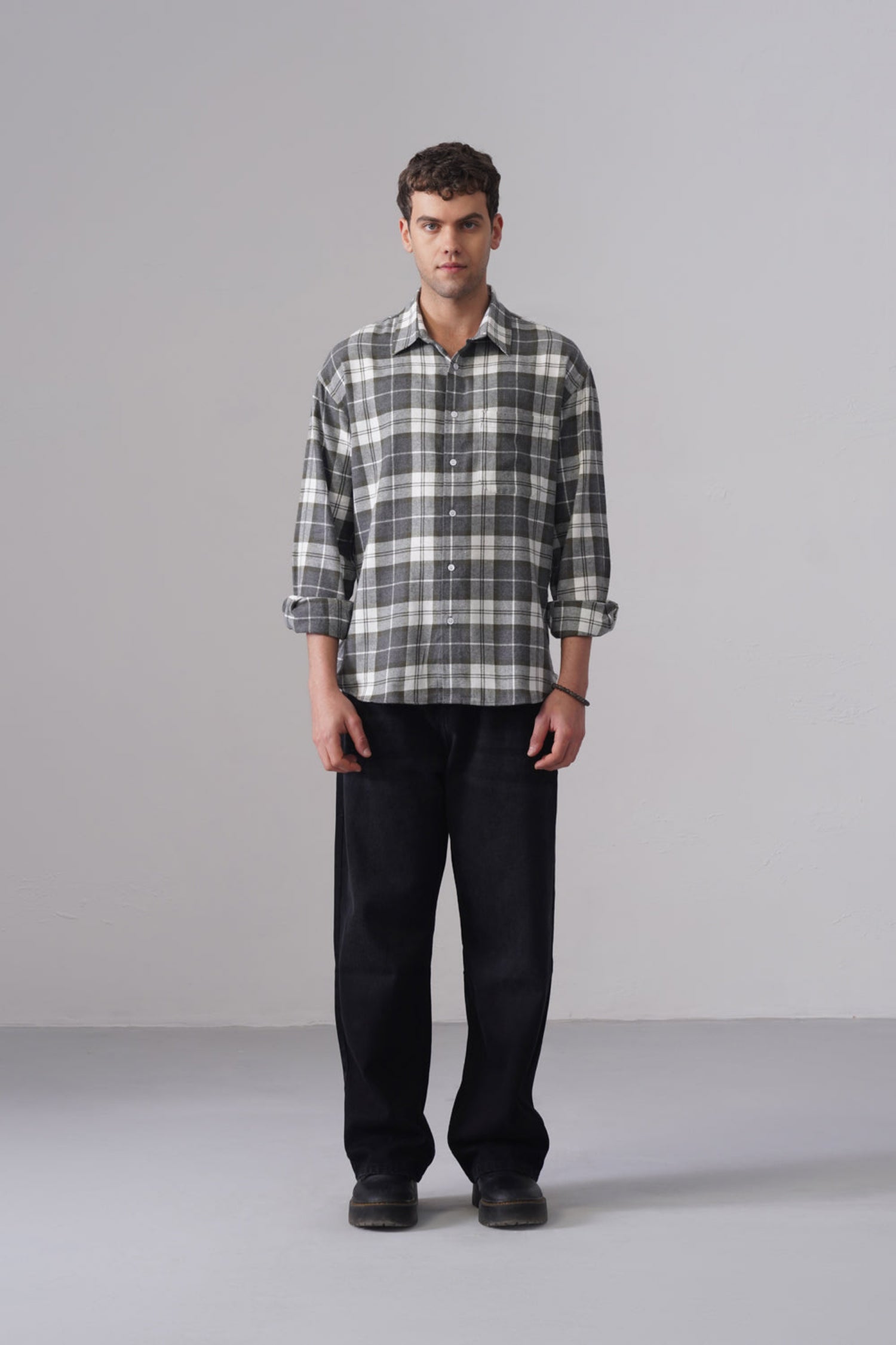 Grey Checkered Cotton Shirt – Loose Fit, Full Sleeves