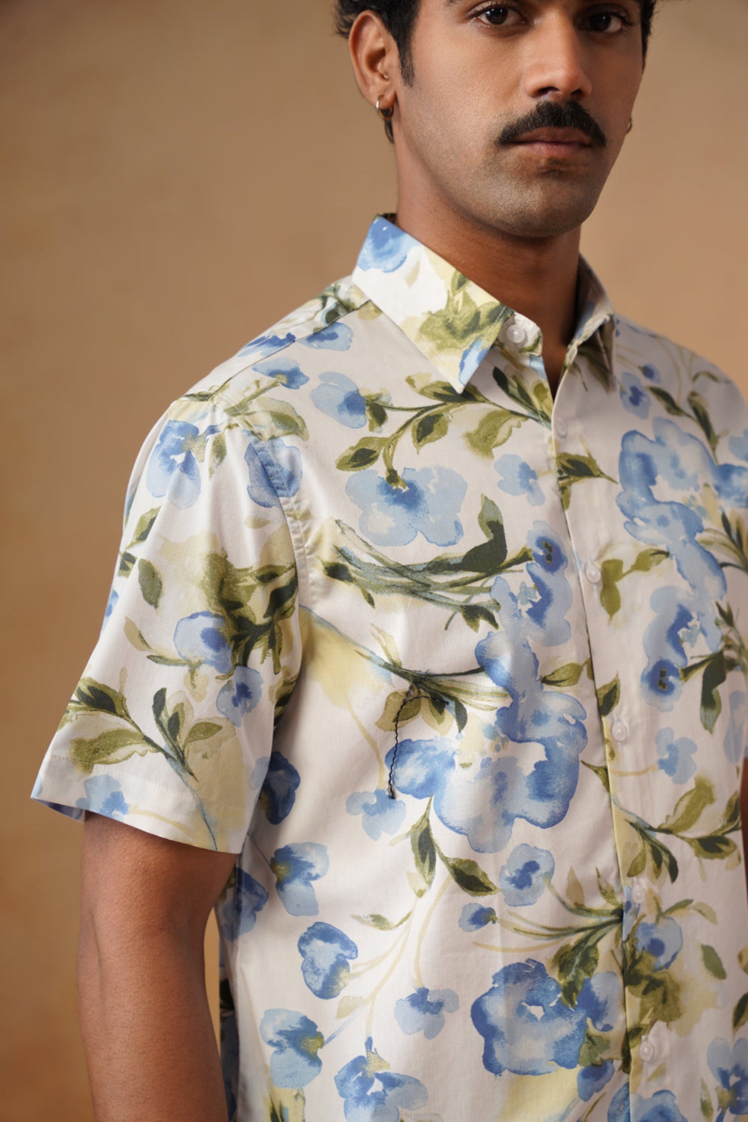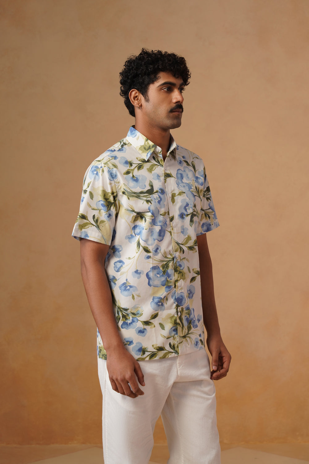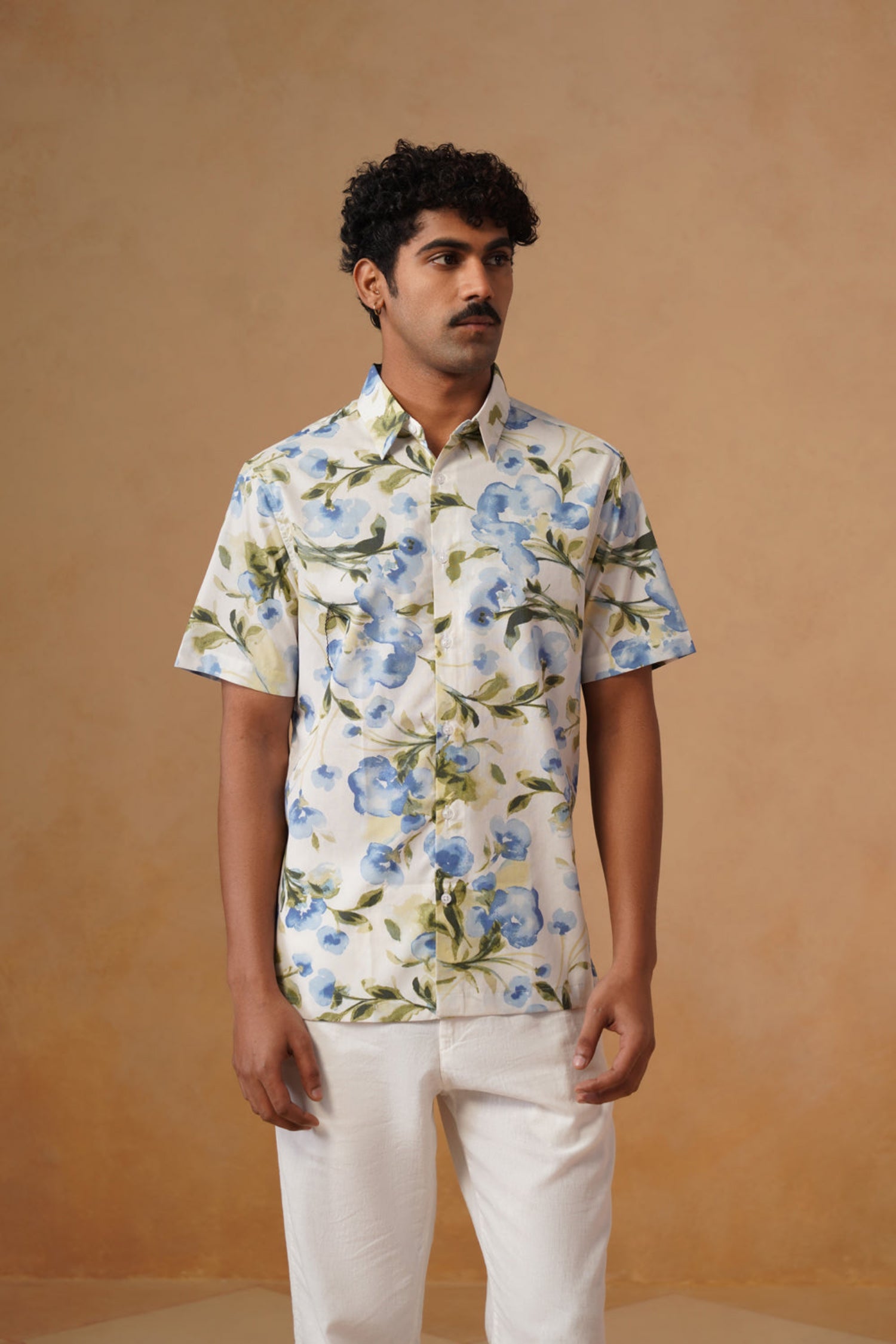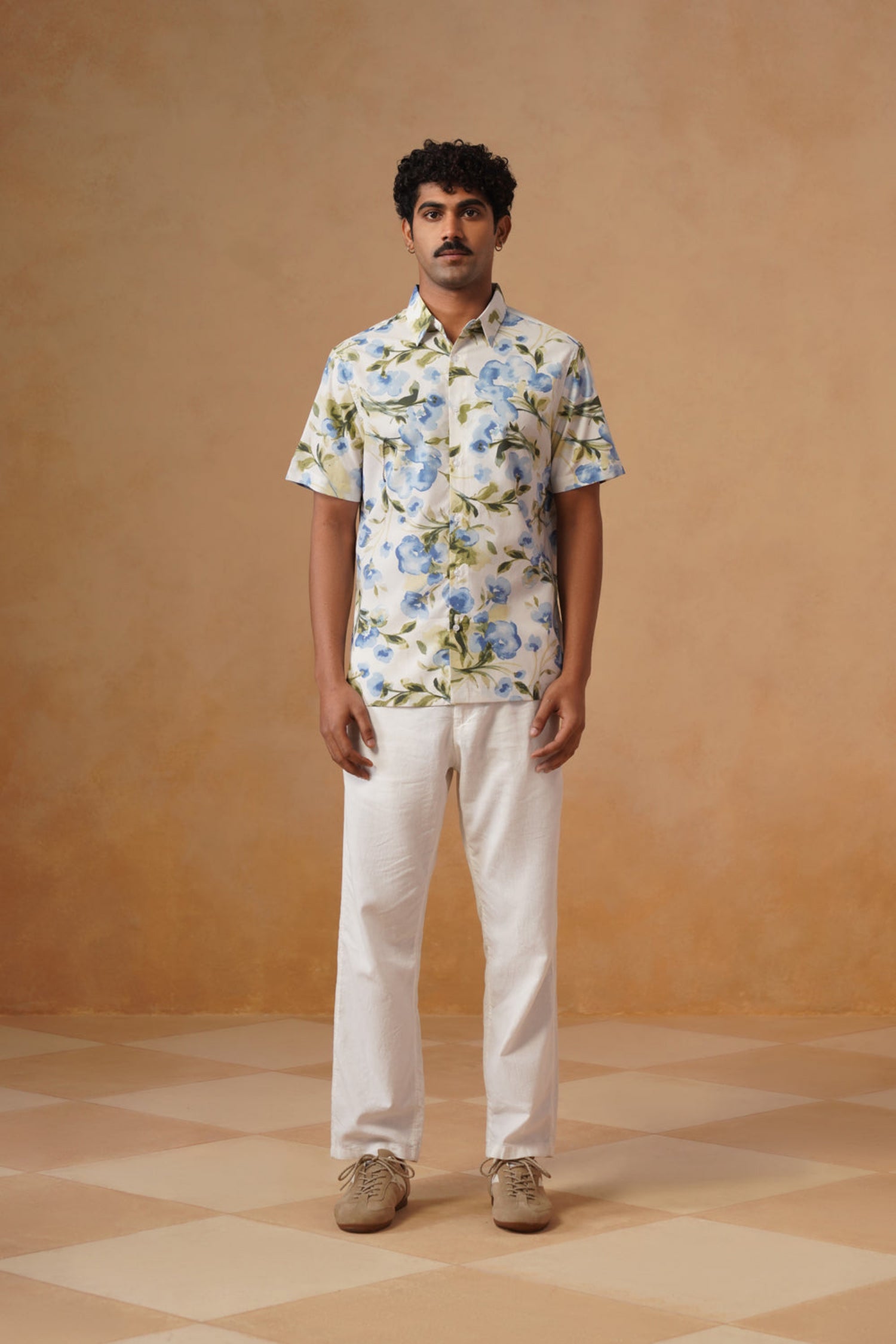 Blue Printed Organic Cotton Blend Shirt – Regular Fit, Half Sleeves
