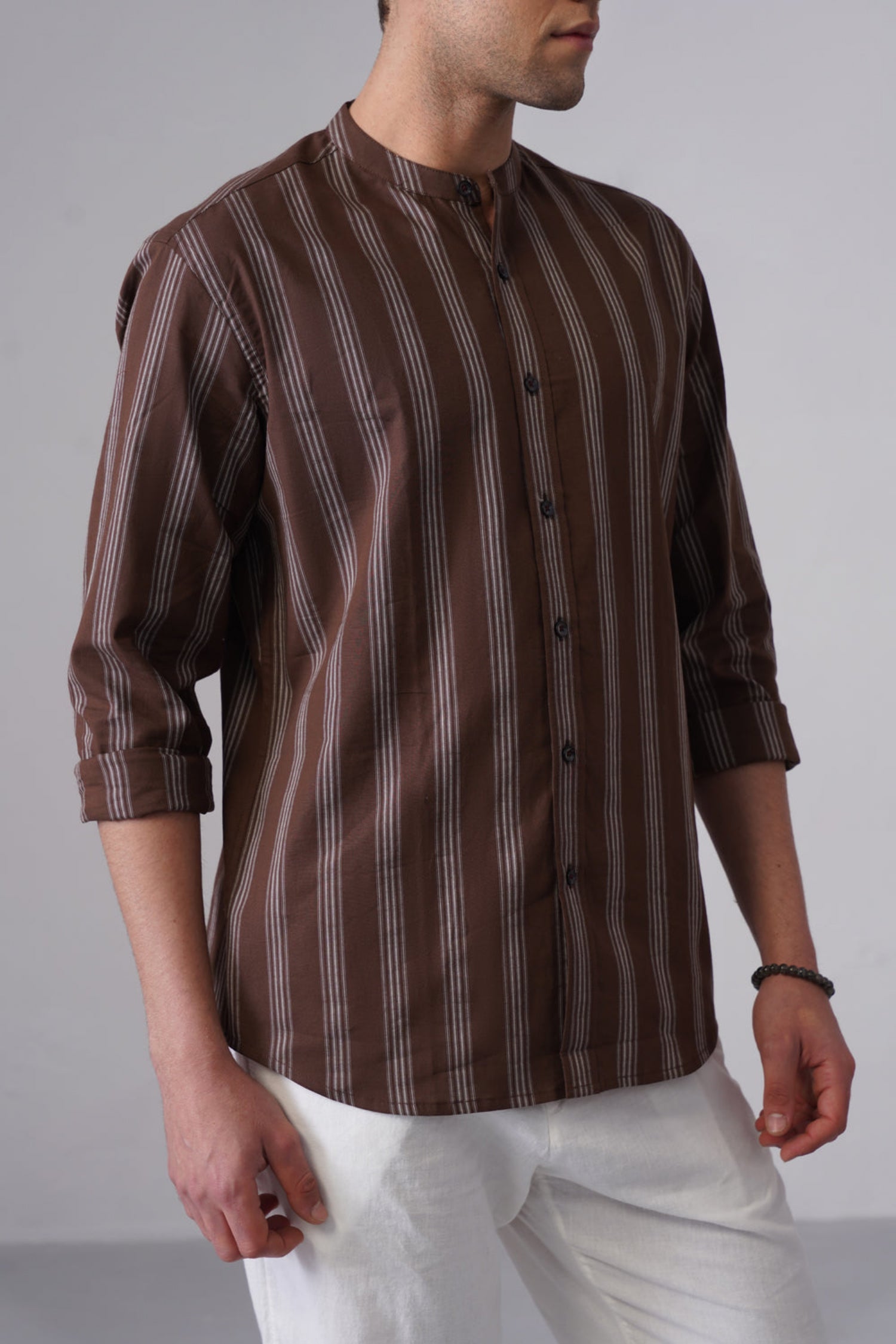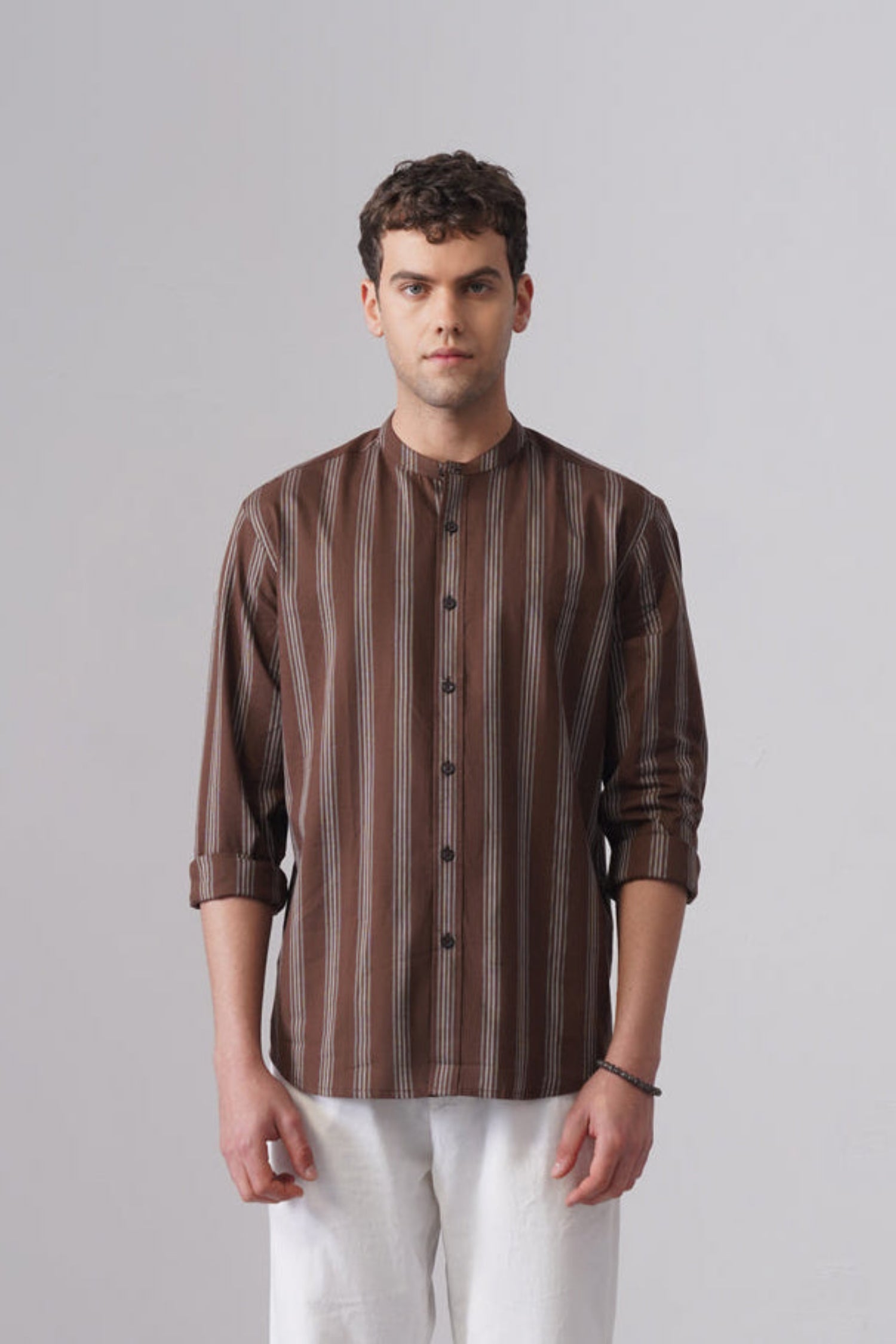 Designed in a regular fit, it delivers a sharp yet comfortable silhouette. The mandarin collar adds a contemporary touch, setting it apart from traditional styles, while the full sleeves enhance its versatility. Finished with a subtle brown striped pattern, this shirt works effortlessly for casual outings, office-casual looks, or evening plans. Pair it with chinos or denims for a refined, confident outfit.