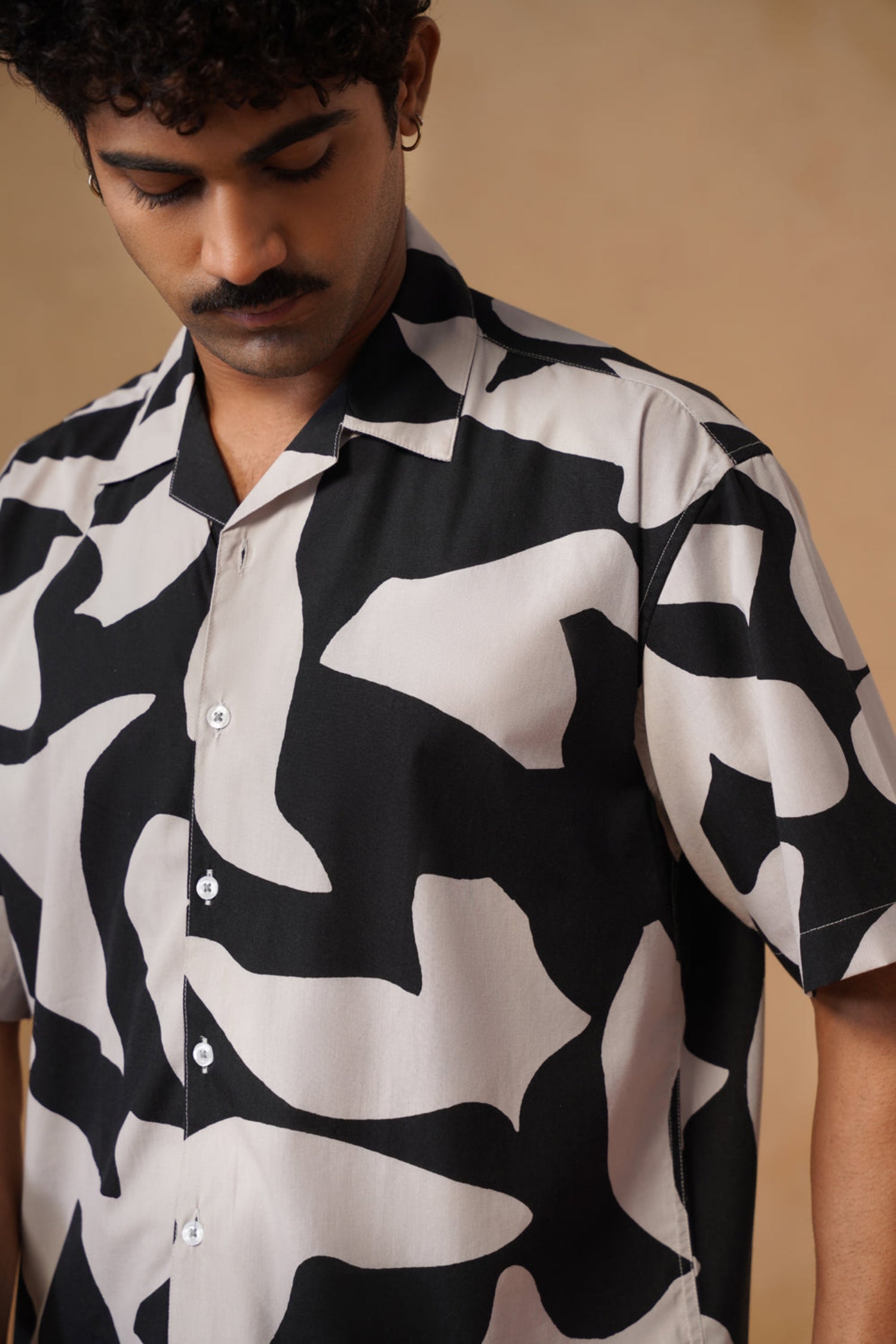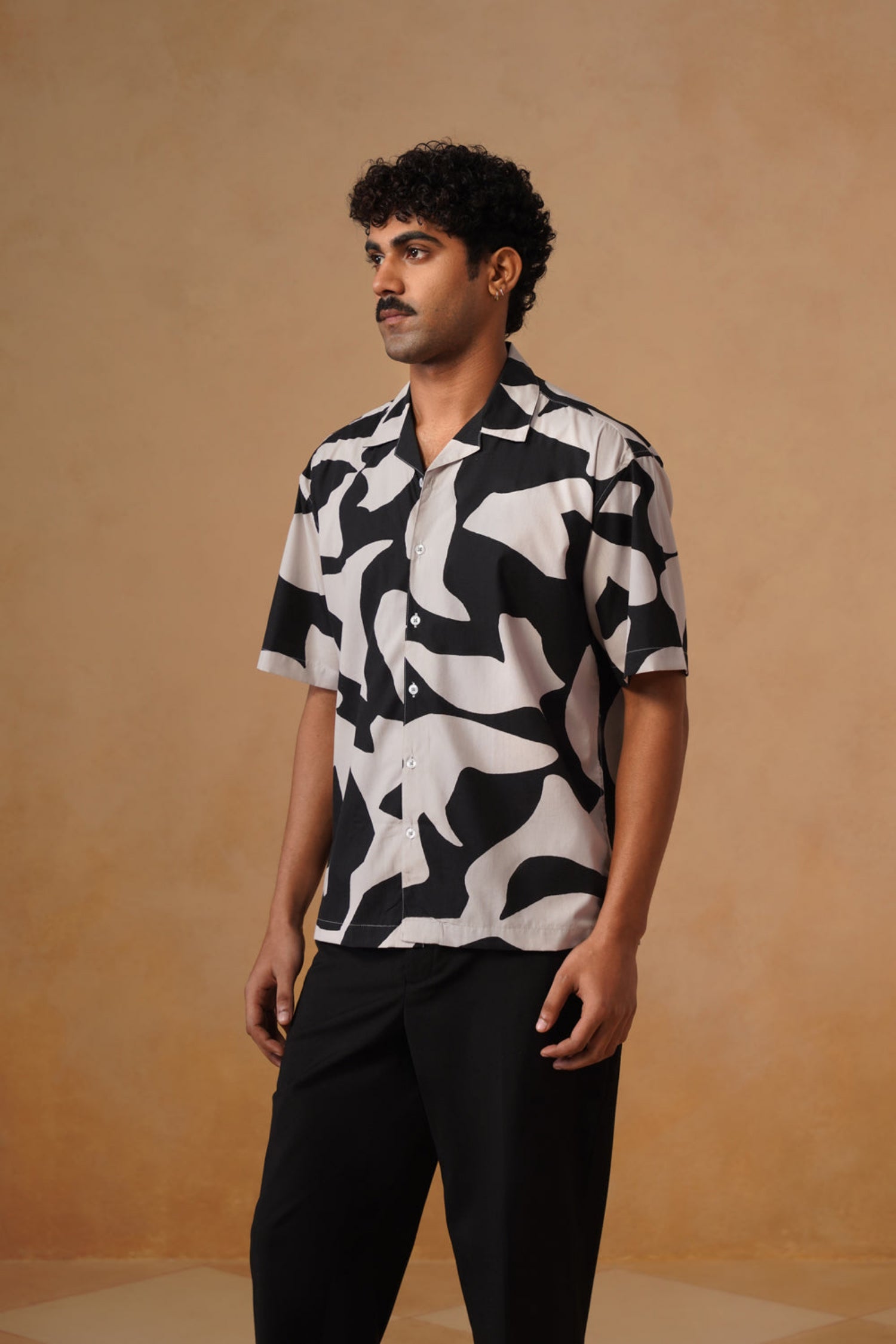 Featuring a loose fit, it delivers an easy, laid-back silhouette, while the Cuban collar enhances its contemporary, vacation-ready vibe. The striking black and white printed pattern adds contrast and character, making this shirt a perfect pick for casual outings, travel days, and weekend plans. Pair it with chinos, denims, or shorts for a confident, relaxed look.