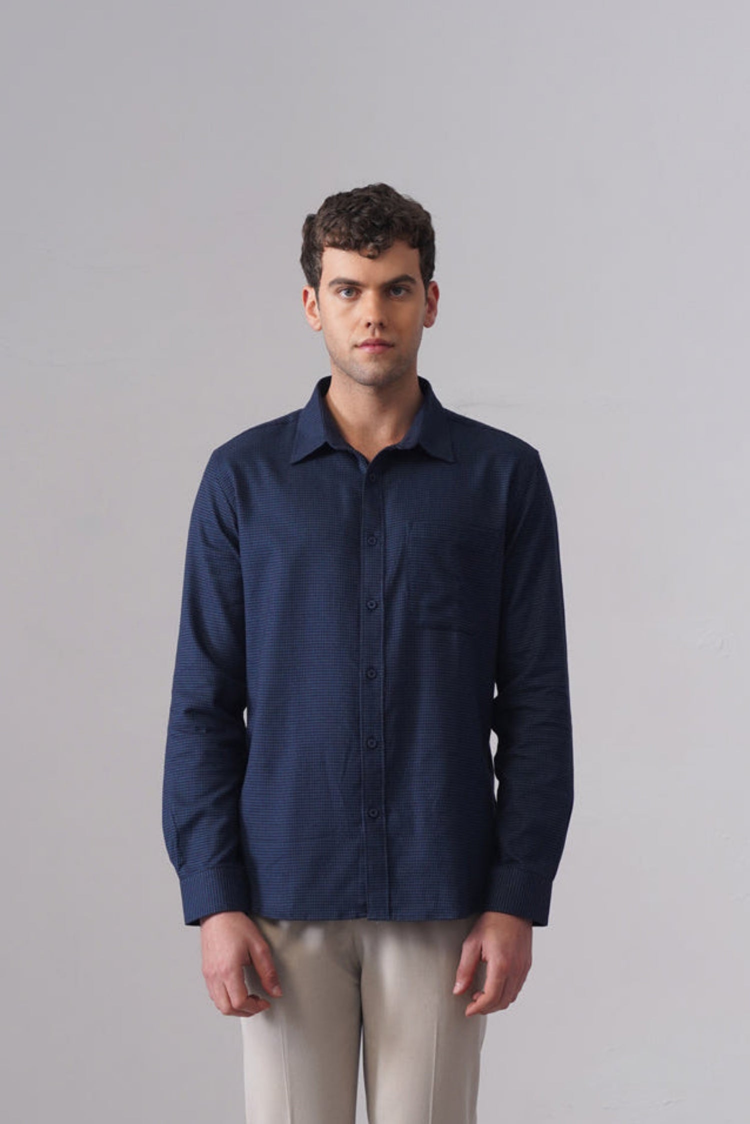 Designed in a regular fit, it offers a clean, structured silhouette that works seamlessly for office-casual settings and daily styling. The normal shirt collar keeps the look classic and versatile, while the blue checked pattern adds subtle character and depth. Pair it with chinos or denims for a polished, dependable outfit.
