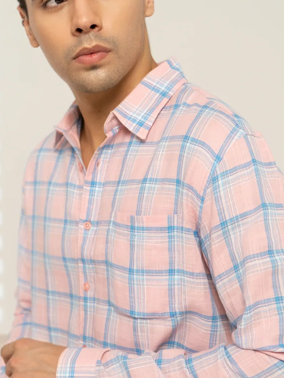 Pink Checked Cotton Shirt – Regular Fit, Full Sleeves