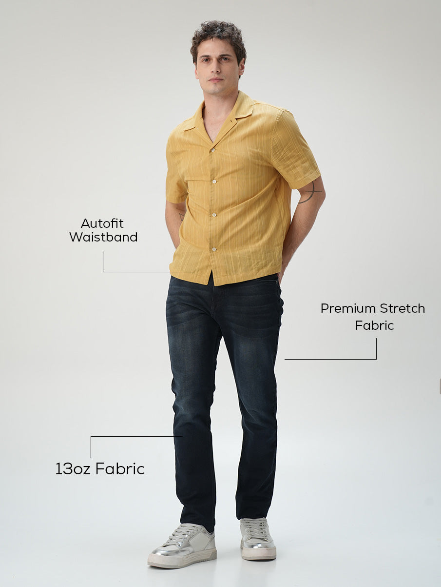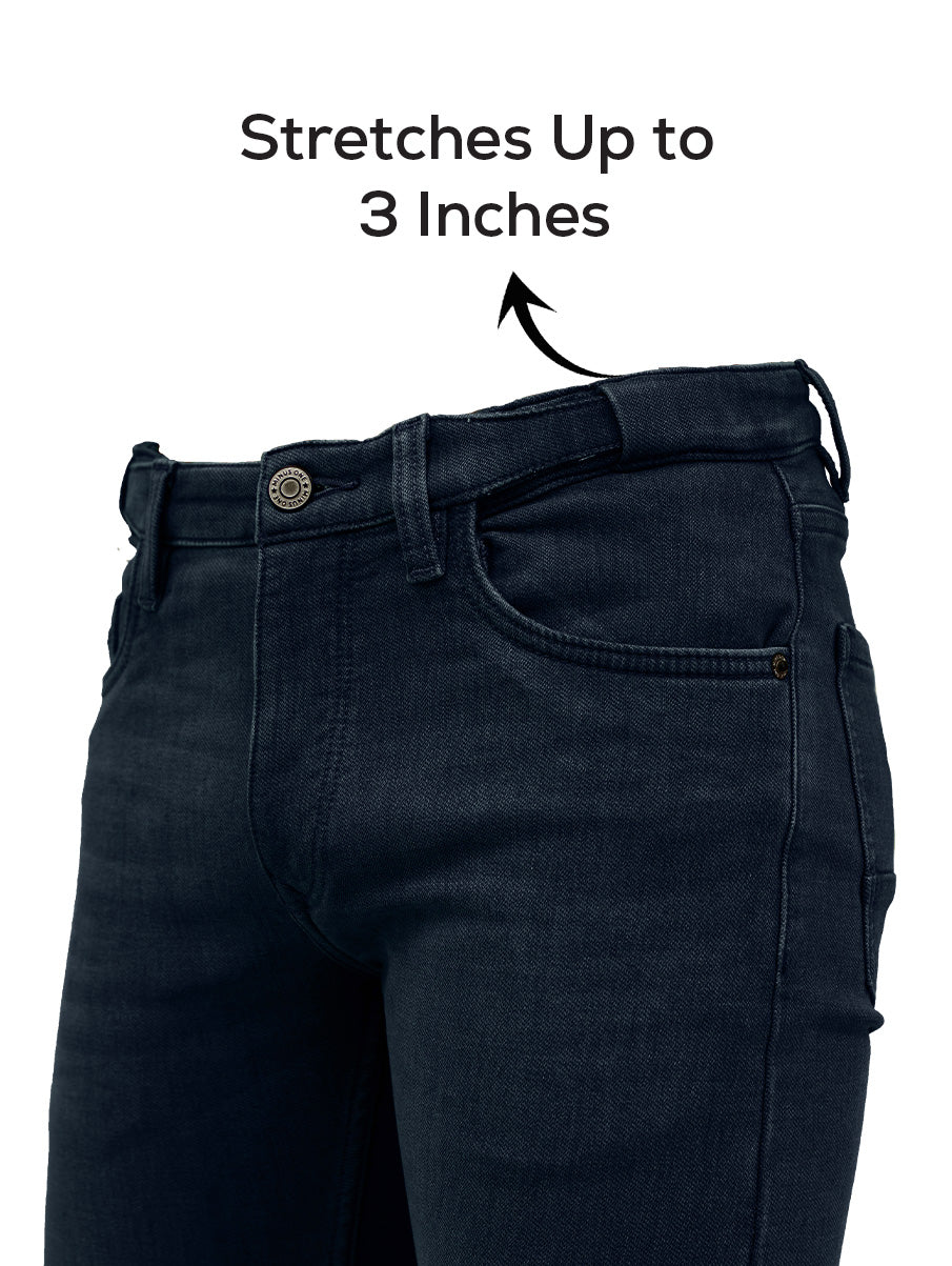 Elasticated Waistband for extra space for movements and right fit. We make denims like they're bespoke. Buy an Inch smaller than what you buy regularly.